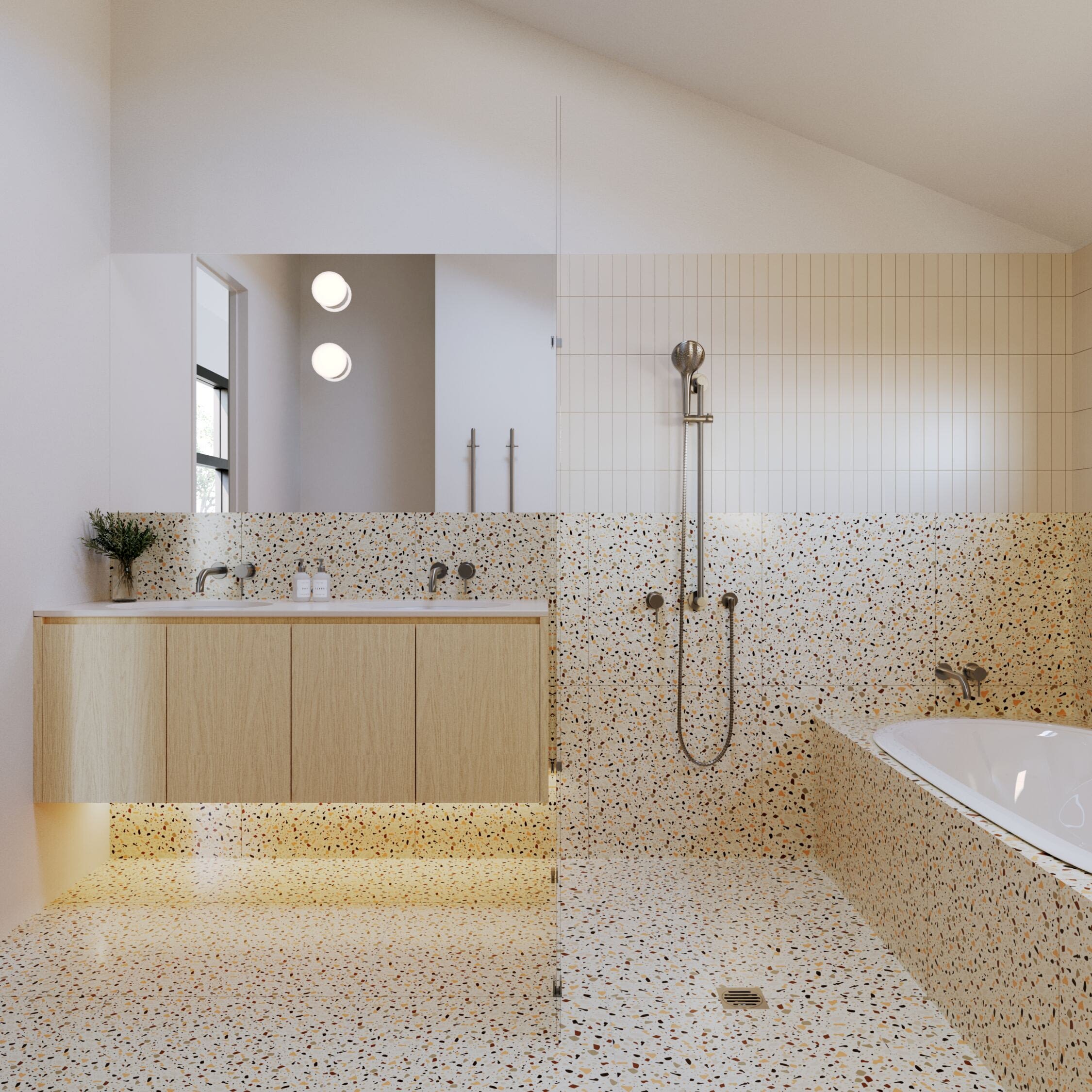 The home’s design embodies a streamlined and contemporary style, blending the interior with the exterior for seamless flow. Key materials include oak timber-look laminate, marble benchtops, and natural concrete flooring, paired with varied tiles to maintain harmony while introducing subtle contrasts.