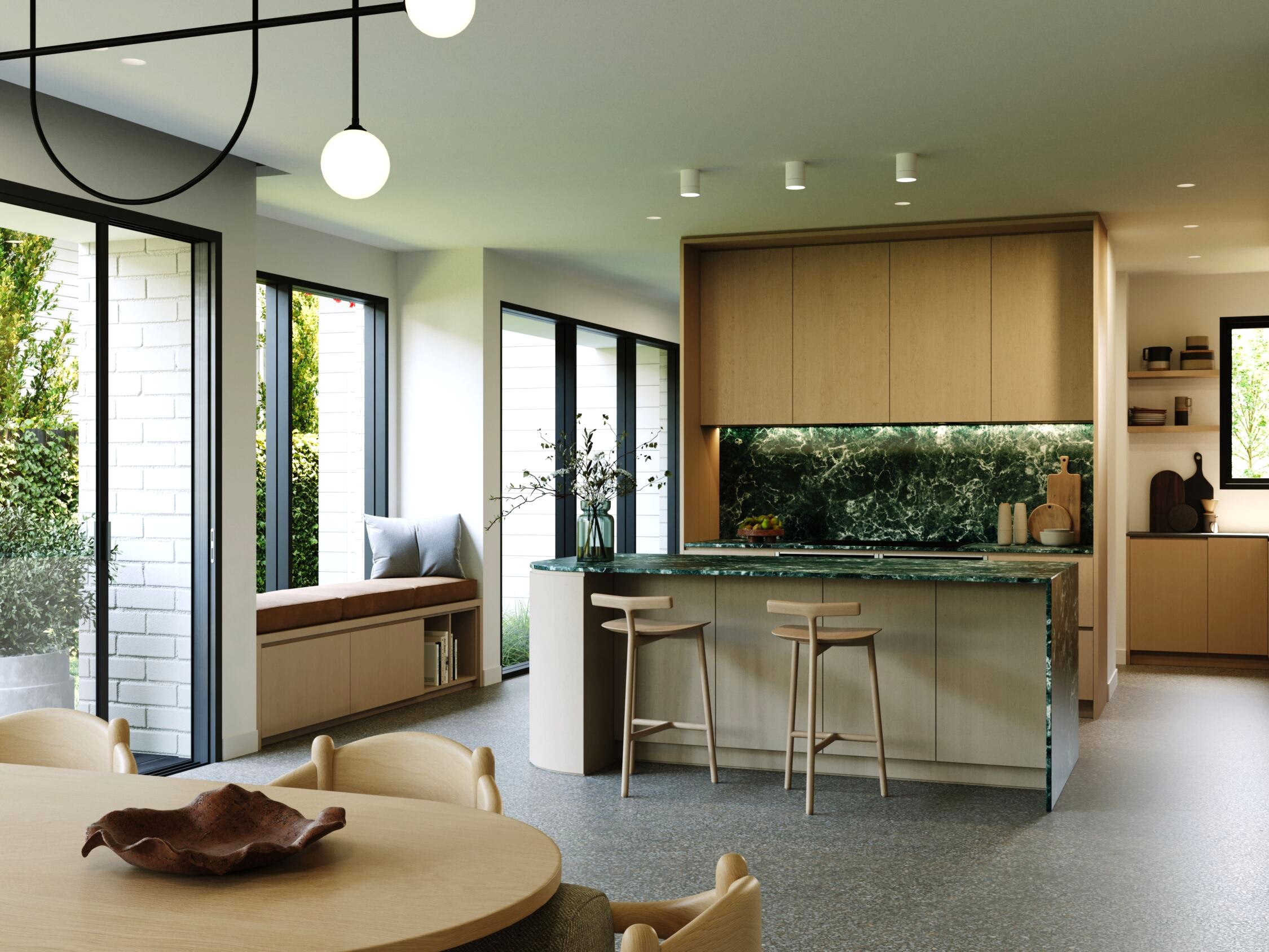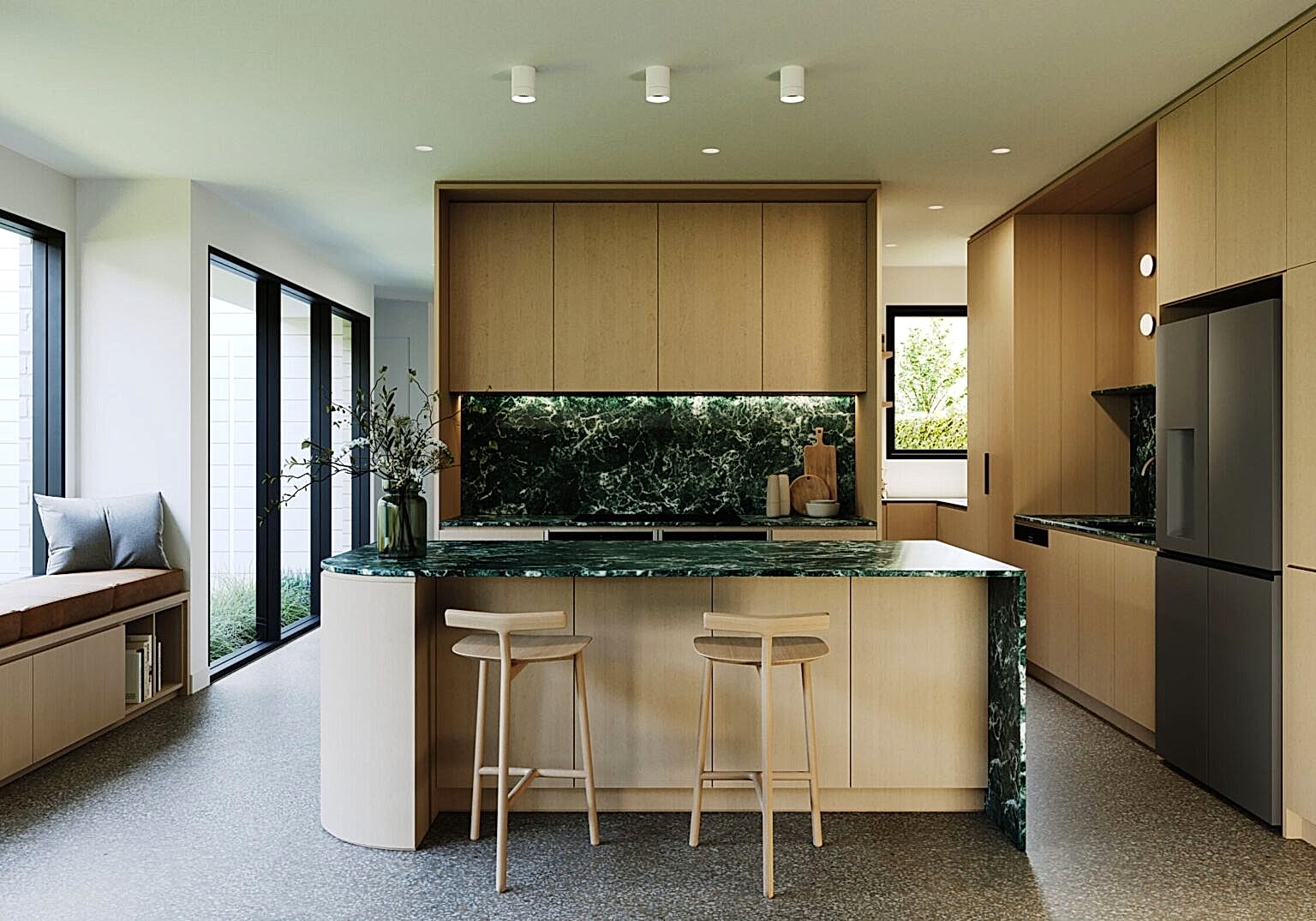 The layout emphasizes functionality and longevity, using low-maintenance, timeless finishes that suit family life. Large north-facing windows and stacker sliding doors bathe the open-plan living area in natural light, complemented by a cosy daybed connecting the indoors to outdoor greenery.